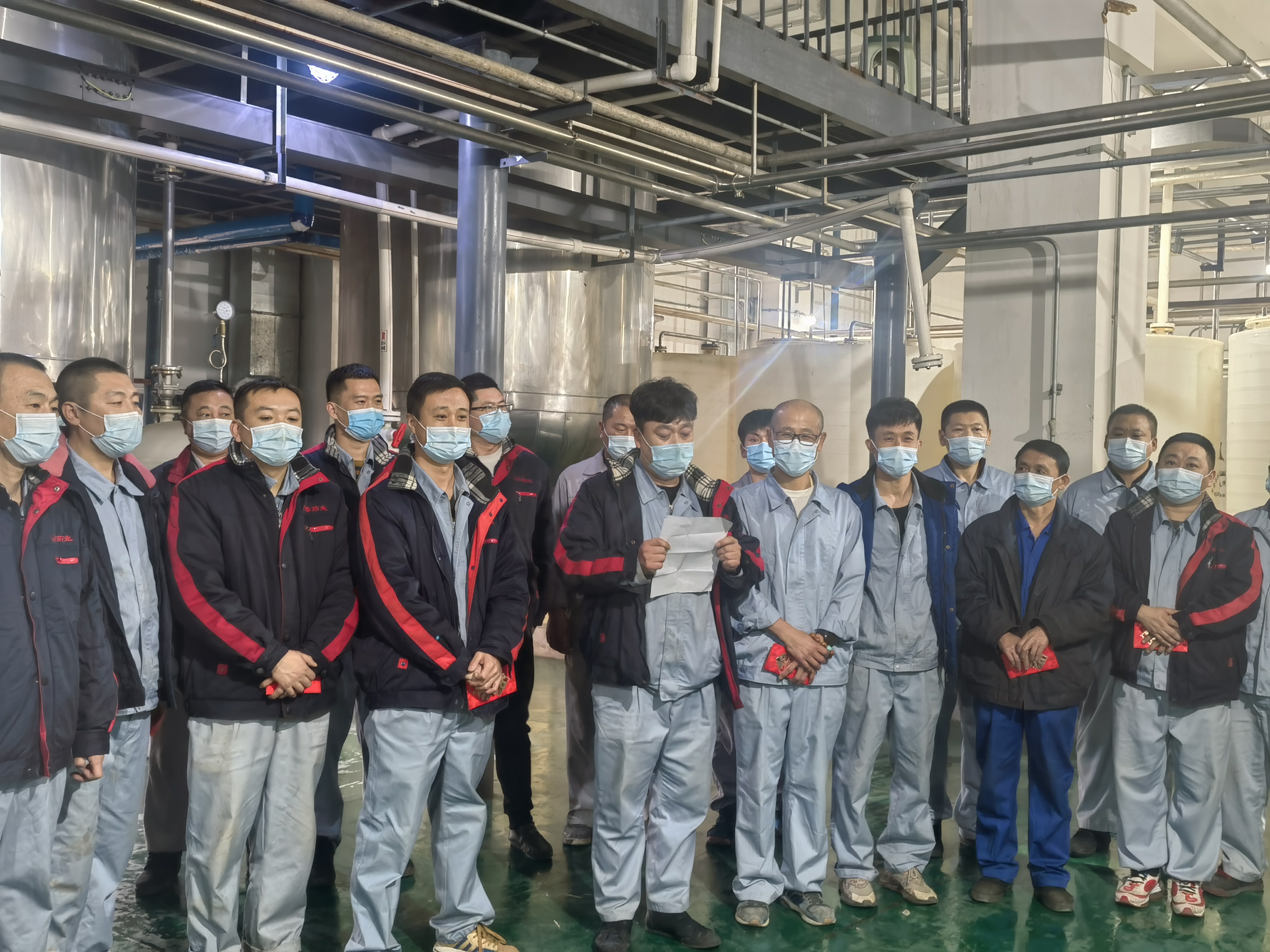 作為保供企業(yè),為了滿足市場(chǎng)藥品需要,公司重點(diǎn)供應(yīng)藥品的生產(chǎn)不能停。經(jīng)過(guò)向上級(jí)疫情防控指揮中心申請(qǐng)獲批準(zhǔn)后,公司研究決定,原料生產(chǎn)總監(jiān)劉剛組織下,在鑫泰基副總經(jīng)理劉新華、原料車間副主任馬尚、于洋帶領(lǐng)下,原料車間的32名一線員工他們甚至都沒(méi)有時(shí)間來(lái)得及安頓好家人,毫不猶豫的從29日起,就開始日夜堅(jiān)守在工作崗位上。由于人員有限,生產(chǎn)任務(wù)艱巨,他們每個(gè)人的工作量超出平常工作強(qiáng)度,有些員工常常深夜還忙碌在生產(chǎn)崗位上,有時(shí)天還沒(méi)亮,就又開始了新一天的工作。白天他們加緊生產(chǎn),晚上睡在潔凈區(qū)、操作間、休息室、辦公室臨時(shí)準(zhǔn)備鋪蓋上窄小的折疊床上。由于緊張的工作頻率,又不能夠很好的休息,很多員工感冒了,但他們沒(méi)有一個(gè)人退縮,沒(méi)有一句怨言,吃著感冒藥、消炎藥崗位上堅(jiān)守了余天,保質(zhì)保量完成了生產(chǎn)任務(wù)。