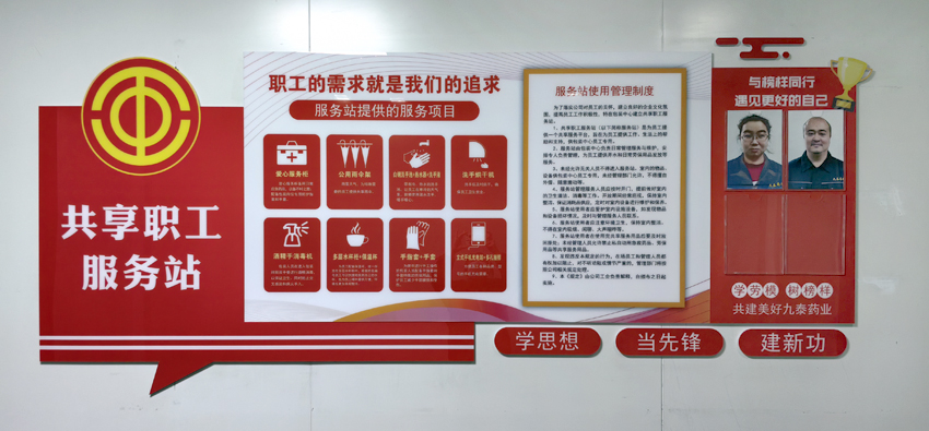 11月25日,公司第一個共享職工服務站在包裝中心成立并投入使用。共享職工服務站文化墻上醒目地提示著共享服務項目、使用管理辦法,為了豐富文化墻內容,還增添了“與榜樣同行遇見更好的自己”優(yōu)秀員工光榮榜。共享職工服務站內共享物品齊全,擺放整齊,共享設施設備即符合藥企規(guī)范,也充滿溫馨,充滿愛意。服務站提供的服務項目包括:1、愛心服務柜。愛心服務柜備用日常應急藥品,以備不時之需;包裝中心員工每天高效、重復的包裝動作很容易被包材劃傷手部,愛心服務柜為包裝崗位員工配備了處理傷口的藥品和防護用品。2、公用雨傘。雨雪天氣,為特殊需要的員工提供共享雨傘。3、白鋼洗手池+熱水器+洗手液。洗手池帶有冷、熱水調節(jié)開關,讓員工在寒冷的天氣里,能夠使用溫水洗手,暖手暖心。4、洗手烘干機。員工進入操作間洗手后及時烘干,確保員工衛(wèi)生安全。5、酒精手消毒機。包裝人員在進入包裝間前雙手要進行酒精消毒,以保證衛(wèi)生,同時防止交叉感染和病從手入。6、多層水杯柜+保溫杯。為每一名員工配備了大容量保溫杯,統(tǒng)一存放在多層水杯柜中,根據(jù)姓名、編號,員工可以快捷地找到自己的水杯,為員工喝熱水提供方便,環(huán)境也更加美觀整潔。7、手指套+手套。服務站為常年進行手工操作的包裝人員配備了手指套和手套特殊的勞保用品,保護員工減少手部磨損和受傷。8、立式手機充電站+多孔插排。方便員工各種品牌、型號的手機充電需要。